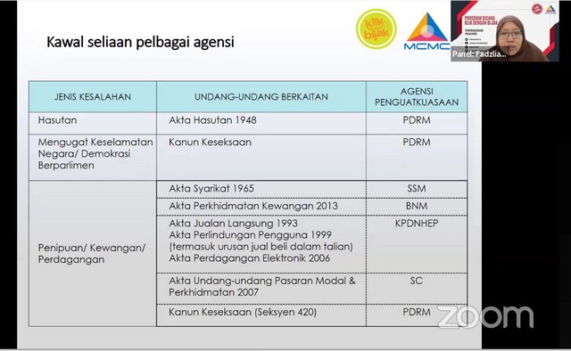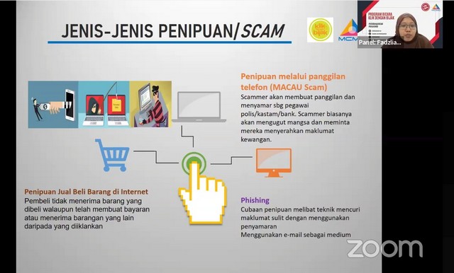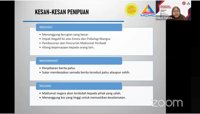 20 Julai 2022 | Aktiviti TerkiniPada 19 Julai 2022, Klik Dengan Bijak telah menganjurkan satu program pengkongsian yang bertajuk “INTERNET : SELAMAT ATAU TIDAK?”. Puan Fadzilah Mazlina Mohammad iaitu Penolong Pengarah dari Pejabat MCMC Negeri Terengganu merupakan penceramah didalam program ini. Program ini berlangsung di live Facebook Klik Dengan Bijak.