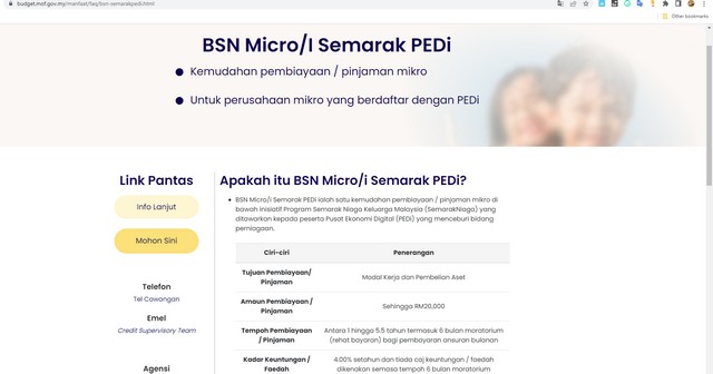 1 Julai 2022 | Aktiviti TerkiniSatu Kemudahan Pinjaman telahpun dibuka khusus kepada semua ushawan yang telahpun berdaftar dengan Pusat Ekonomi Digital Keluarga Malaysia(PEDi). Pinjaman ini telah dikemukakan oleh Kementerian Kewangan Malaysia di dalam perancangan Bajet Malaysia untuk tahun 2022 dan akan diuruskan oleh sebuah agensi iaitu Bank Simpanan Nasional (BSN), pinjaman ini boleh dilakukan untuk tujuan sebagai Modal Perniagaan ataupun untuk pembelian aset perniagaan. Mana-Mana ushawan PEDi yang berminat untuk melakukan pinjaman, anda boleh melakukan semakan terhadap terma dan syarat sebelum mengemukakan permohonan pada pautan ini https://budget.mof.gov.my/manfaat/faq/bsn-semarakpedi.html.