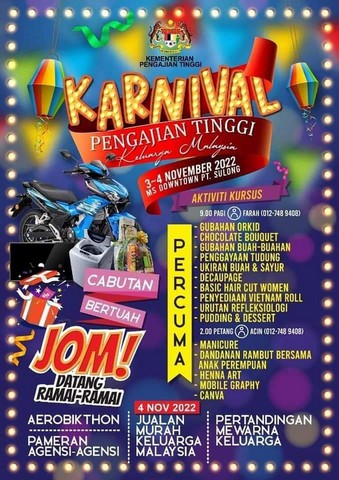 Pengunjung berpeluang untuk singgah ke Jualan Murah Keluarga Malaysia, gerai-gerai makanan dan produk IKS, pertunjukan motosikal, pertandingan mewarna kanak-kanak, senamrobik dan bermacam-macam lagi. Karnival ini turut dimeriahkan dengan pelbagai persembahan kesenian dan kebudayaan pelajar IPT, kuiz dan cabutan bertuah, demonstrasi TVET dan STEM, serta sesi perkongsian bermanfaat berkaitan pendidikan tinggi.