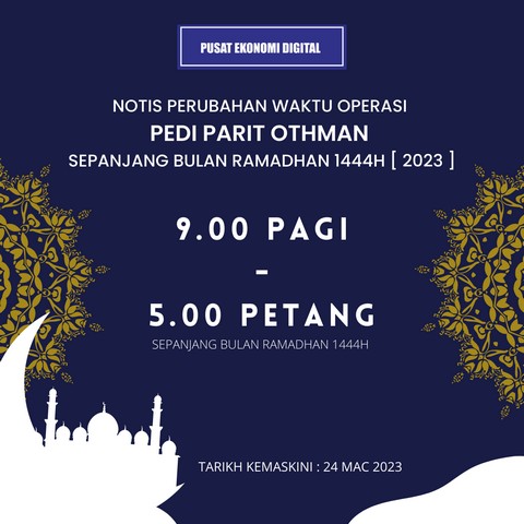 24 Mac 2023 | Aktiviti TerkiniAdalah dimaklumkan bahawa waktu operasi bagi PEDi Parit Othman sepanjang bulan Ramadhan 1444H / 2023 ini akan bertukar kepada pukul 9.00 pagi sehingga 5.00 petang setiap hari kecuali cuti umum. Buat semua yang beragama islam, kami mengucapkan Selamat menyambut Ramadhan. Semoga Ramadhan kali ini lebih baik dari Ramadhan sebelum ini.