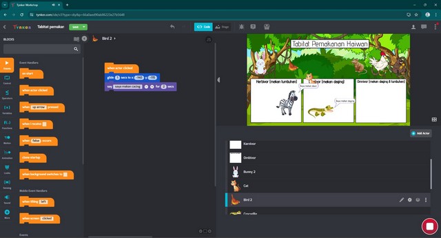 Kelas diteruskan dengan pembelajaran asas coding melalui aplikasi Tynker. Para pelajar diajar untuk menyiapkan set projek mengenai tabiat pemakanan haiwan. Sesi pembelajaran termasuk mempelajari cara untuk memasukkan stage / gambar latar, actor / watak, perkataan, elemen dan lain-lain. Mereka diminta untuk mencari sendiri contoh haiwan untuk dimasukkan didalam kategori terbabit.