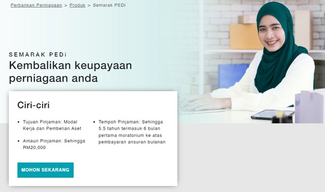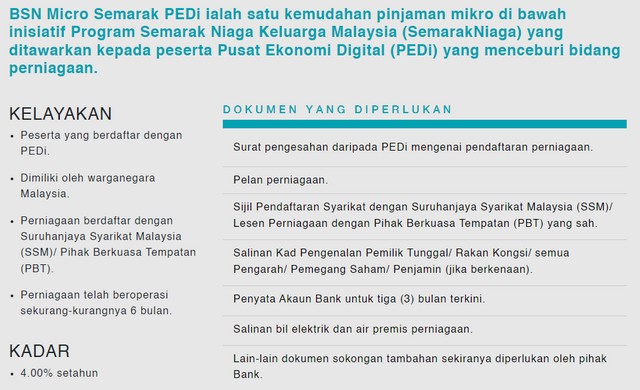 7 Julai 2022 | Aktiviti TerkiniBSN Micro Semarak PEDi ialah satu kemudahan pinjaman mikro di bawah inisiatif Program Semarak Niaga (SemarakNiaga) yang ditawarkan kepada peserta Pusat Ekonomi Digital (PEDi) yang menceburi bidang perniagaan. Skim Pembiayaan BSN Micro/i ini menawarkan jumlah pembiayaan sehingga RM75,000 pada kadar 4.0 peratus (kadar asas tetap) untuk tempoh pembiayaan sehingga 5.5 tahun termasuk moratorium (rehat bayaran) bagi enam bulan pertama ke atas pembayaran ansuran bulanan.